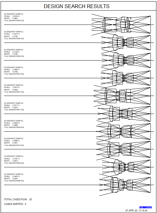 如果SYNOPSYS软件的快不只是包括优化快,在寻找初始结构上,也称得上一绝,不在是像传统方法一样,需要找到大量的镜头,在里面找到合适的,这项工作无疑是巨大且麻烦的,SYNOPSYS找到了一种新的方法,依靠定焦和变焦搜索可以快速找到想要的初始结构,而且不止1个初始结构,同时生成10个最好的初始结构供我挑选呐。以下图形是定焦搜索五片式出来的初始结构。