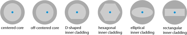 图 3:双包层光纤 的各种设计。纤芯为蓝色,内包层为浅灰色,外包层为深灰色。没有显示经常使用的附加聚合物涂层。
