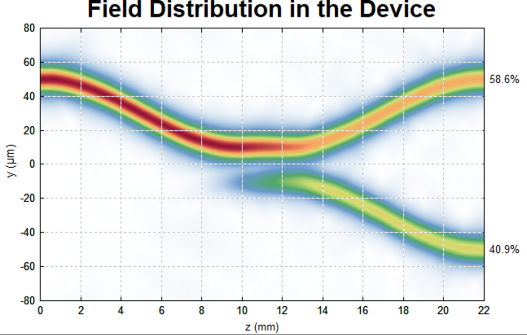 该脚本基于光束传播法(BPM),模拟了双芯光纤耦合器的核心特性,涵盖折射率剖面、光场在器件内的传输演化与输出场型;同时扫描波导间距和入射波长,分析两者对耦合强度(端口功率分配)的影响,为器件参数优化提供量化依据。
