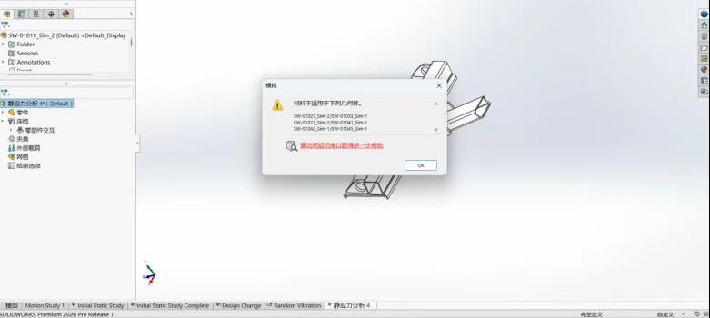 在进行装配体分析时,由于用户忘记为某些零件给定材料,或者某些零件网格划分失败而导致求解报错,这是经常会发生的情况。针对这一情况,SOLIDWORKS Simulation 2026中的求解报错提示会更加细致,能直接显示没有给定材料/网格划分失败的零件及名称,帮助用户快速查找并作出修改,提升仿真效率。