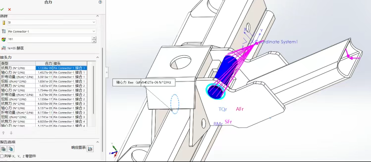随机振动分析是SOLIDWORKS Simulation线性动力学中的功能。在2026版本中,如果用户在随机振动分析中定义了销钉接头,那么可以在求解结果中查看销钉接头力。Simulation会根据销钉连接的接合面对应输出接头力,如轴力、剪力、弯矩和扭矩,用户可以很方便的查看随机振动作用下销钉的接头力大小,也可以输出对应的响应曲线。