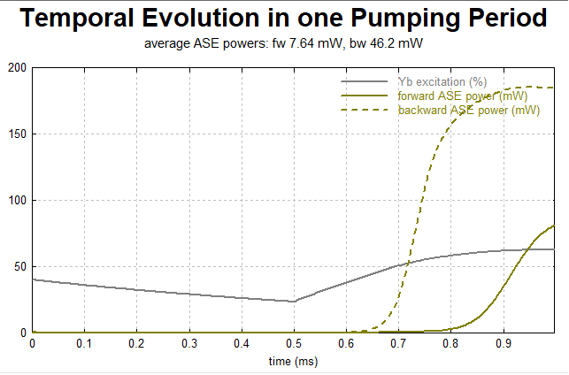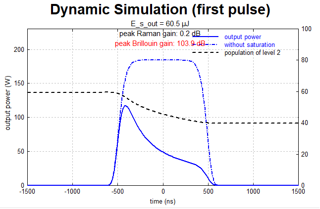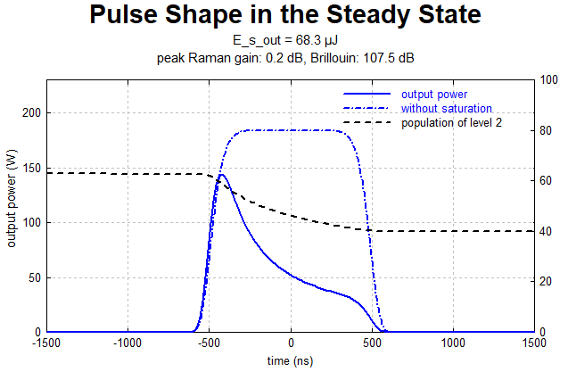 一个掺镱光纤放大器(采用不含 ASE 的简化模型)首先在弱输入信号下运行。在光纤达到稳态激发状态后(如示意图 1 所示),我们采用具有超高斯形状的时变信号输入功率,其峰值显著高于之前的稳态值。通过这种方式,我们能获得较高的信号峰值功率,但在信号放大过程中增益会急剧下降。
