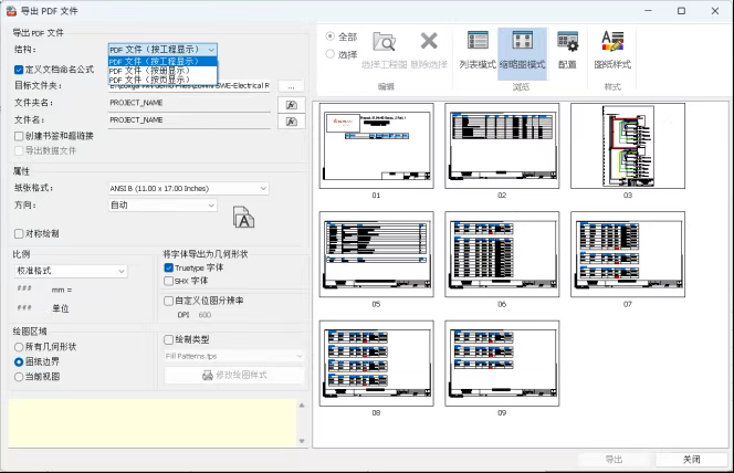 我们在 SOLIDWORKS 电气原理图中新增了导出为 PDF 的新选项,包括按项目、结构或文件进行导出,还新增了定义文档命名的选项,以及带有文件名和文件夹名选项的公式。我们最后的一个选项是关于方向的,自动选项中新增了自动旋转功能,用于对项目中的横向和纵向图纸进行旋转。这是导出的 PDF 文件。您可以看到它会根据不同的横向和纵向图纸自动调整方向。