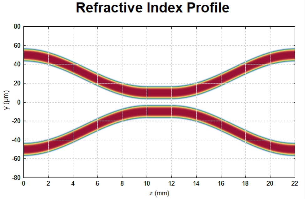 该脚本基于光束传播法(BPM),模拟了双芯光纤耦合器的核心特性,涵盖折射率剖面、光场在器件内的传输演化与输出场型;同时扫描波导间距和入射波长,分析两者对耦合强度(端口功率分配)的影响,为器件参数优化提供量化依据。